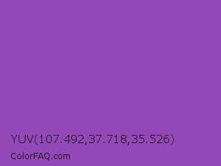 YUV 107.492,37.718,35.526 Color is a normal purple color and the nearest color is Purple Plum #9c51b6. Hex code #9448b8 and RGB value is rgb(148,72,184). In RGB color space, this color is composed of 58% red, 28% green, 72% blue, In CMYK color space, this color is composed of 20% cyan, 61% magenta, 0% yellow , 28% black , In HSL color space, this color has a hue angle of 281° , 44% saturation and 50% lightness.