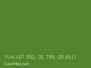 YUV 107.502,-31.799,-20.611 Color is a normal green color and the nearest color is Sap Green #507d2a. Hex code #54842b and RGB value is rgb(84,132,43). In RGB color space, this color is composed of 33% red, 52% green, 17% blue, In CMYK color space, this color is composed of 36% cyan, 0% magenta, 67% yellow , 48% black , In HSL color space, this color has a hue angle of 92° , 51% saturation and 34% lightness.