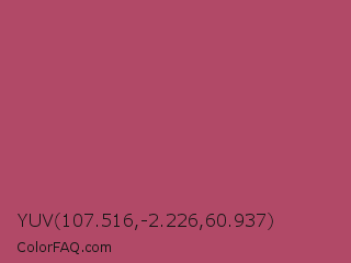 YUV 107.516,-2.226,60.937 Color is a normal rose color and the nearest color is Deep Blush #b44668. Hex code #b14967 and RGB value is rgb(177,73,103). In RGB color space, this color is composed of 69% red, 29% green, 40% blue, In CMYK color space, this color is composed of 0% cyan, 59% magenta, 42% yellow , 31% black , In HSL color space, this color has a hue angle of 343° , 42% saturation and 49% lightness.