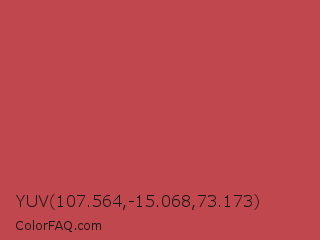 YUV 107.564,-15.068,73.173 Color is a normal red color and the nearest color is Bittersweet Shimmer #bf4f51. Hex code #bf474d and RGB value is rgb(191,71,77). In RGB color space, this color is composed of 75% red, 28% green, 30% blue, In CMYK color space, this color is composed of 0% cyan, 63% magenta, 60% yellow , 25% black , In HSL color space, this color has a hue angle of 357° , 48% saturation and 51% lightness.