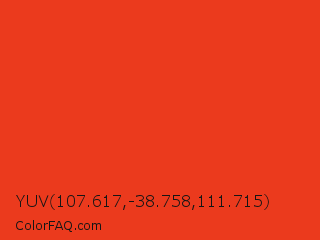 YUV 107.617,-38.758,111.715 Color is a normal red color and the nearest color is Pomegranate #f34723. Hex code #eb3a1d and RGB value is rgb(235,58,29). In RGB color space, this color is composed of 92% red, 23% green, 11% blue, In CMYK color space, this color is composed of 0% cyan, 75% magenta, 88% yellow , 8% black , In HSL color space, this color has a hue angle of 8° , 84% saturation and 52% lightness.