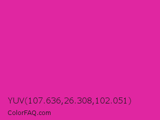 YUV 107.636,26.308,102.051 Color is a normal magenta color and the nearest color is Frostbite #e936a7. Hex code #e026a1 and RGB value is rgb(224,38,161). In RGB color space, this color is composed of 88% red, 15% green, 63% blue, In CMYK color space, this color is composed of 0% cyan, 83% magenta, 28% yellow , 12% black , In HSL color space, this color has a hue angle of 320° , 75% saturation and 51% lightness.