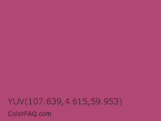 YUV 107.639,4.615,59.953 Color is a normal rose color and the nearest color is Mystic Maroon #ad4379. Hex code #b04775 and RGB value is rgb(176,71,117). In RGB color space, this color is composed of 69% red, 28% green, 46% blue, In CMYK color space, this color is composed of 0% cyan, 60% magenta, 34% yellow , 31% black , In HSL color space, this color has a hue angle of 334° , 43% saturation and 48% lightness.