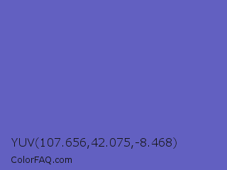 YUV 107.656,42.075,-8.468 Color is a normal indigo color and the nearest color is Blue Violet #6456b7. Hex code #6260c1 and RGB value is rgb(98,96,193). In RGB color space, this color is composed of 38% red, 38% green, 76% blue, In CMYK color space, this color is composed of 49% cyan, 50% magenta, 0% yellow , 24% black , In HSL color space, this color has a hue angle of 241° , 44% saturation and 57% lightness.