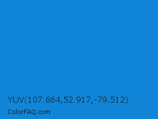 YUV 107.664,52.917,-79.512 Color is a normal blue color and the nearest color is Rich Electric Blue #0892d0. Hex code #1185d7 and RGB value is rgb(17,133,215). In RGB color space, this color is composed of 7% red, 52% green, 84% blue, In CMYK color space, this color is composed of 92% cyan, 38% magenta, 0% yellow , 16% black , In HSL color space, this color has a hue angle of 205° , 85% saturation and 45% lightness.