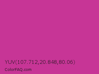 YUV 107.712,20.848,80.06 Color is a normal magenta color and the nearest color is Royal Fuchsia #ca2c92. Hex code #c73596 and RGB value is rgb(199,53,150). In RGB color space, this color is composed of 78% red, 21% green, 59% blue, In CMYK color space, this color is composed of 0% cyan, 73% magenta, 25% yellow , 22% black , In HSL color space, this color has a hue angle of 320° , 58% saturation and 49% lightness.