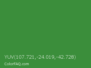 YUV 107.721,-24.019,-42.728 Color is a normal green color and the nearest color is May Green #4c9141. Hex code #3b8e3b and RGB value is rgb(59,142,59). In RGB color space, this color is composed of 23% red, 56% green, 23% blue, In CMYK color space, this color is composed of 58% cyan, 0% magenta, 58% yellow , 44% black , In HSL color space, this color has a hue angle of 120° , 41% saturation and 39% lightness.