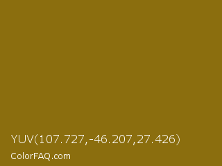 YUV 107.727,-46.207,27.426 Color is a dark yellow color and the nearest color is Corn Harvest #8b6b0b. Hex code #8b6e0e and RGB value is rgb(139,110,14). In RGB color space, this color is composed of 55% red, 43% green, 5% blue, In CMYK color space, this color is composed of 0% cyan, 21% magenta, 90% yellow , 45% black , In HSL color space, this color has a hue angle of 46° , 82% saturation and 30% lightness.
