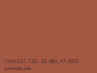 YUV 107.732,-20.081,47.593 Color is a normal red color and the nearest color is Sepia Skin #9e5b40. Hex code #a25843 and RGB value is rgb(162,88,67). In RGB color space, this color is composed of 64% red, 35% green, 26% blue, In CMYK color space, this color is composed of 0% cyan, 46% magenta, 59% yellow , 36% black , In HSL color space, this color has a hue angle of 13° , 41% saturation and 45% lightness.