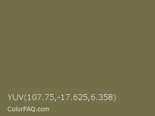 YUV 107.75,-17.625,6.358 Color is a normal yellow color and the nearest color is Go Ben #726d4e. Hex code #736f48 and RGB value is rgb(115,111,72). In RGB color space, this color is composed of 45% red, 44% green, 28% blue, In CMYK color space, this color is composed of 0% cyan, 3% magenta, 37% yellow , 55% black , In HSL color space, this color has a hue angle of 54° , 23% saturation and 37% lightness.