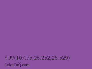 YUV 107.75,26.252,26.529 Color is a normal purple color and the nearest color is Royal Purple #7851a9. Hex code #8a52a1 and RGB value is rgb(138,82,161). In RGB color space, this color is composed of 54% red, 32% green, 63% blue, In CMYK color space, this color is composed of 14% cyan, 49% magenta, 0% yellow , 37% black , In HSL color space, this color has a hue angle of 283° , 33% saturation and 48% lightness.
