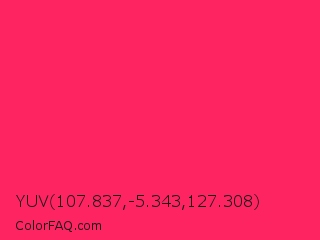 YUV 107.837,-5.343,127.308 Color is a normal rose color and the nearest color is Awesome #ff2052. Hex code #fd2461 and RGB value is rgb(253,36,97). In RGB color space, this color is composed of 99% red, 14% green, 38% blue, In CMYK color space, this color is composed of 0% cyan, 86% magenta, 62% yellow , 1% black , In HSL color space, this color has a hue angle of 343° , 98% saturation and 57% lightness.