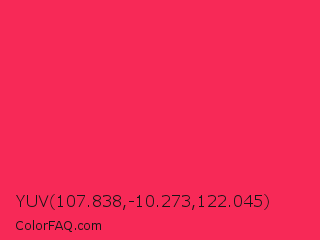 YUV 107.838,-10.273,122.045 Color is a normal red color and the nearest color is Awesome #ff2052. Hex code #f72957 and RGB value is rgb(247,41,87). In RGB color space, this color is composed of 97% red, 16% green, 34% blue, In CMYK color space, this color is composed of 0% cyan, 83% magenta, 65% yellow , 3% black , In HSL color space, this color has a hue angle of 347° , 93% saturation and 56% lightness.