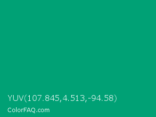 YUV 107.845,4.513,-94.58 Color is a normal cyan color and the nearest color is Green Munsell #00a877. Hex code #00a175 and RGB value is rgb(0,161,117). In RGB color space, this color is composed of 0% red, 63% green, 46% blue, In CMYK color space, this color is composed of 100% cyan, 0% magenta, 27% yellow , 37% black , In HSL color space, this color has a hue angle of 164° , 100% saturation and 32% lightness.