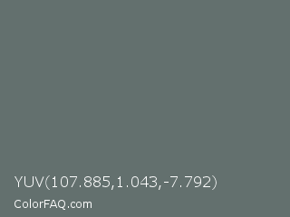 YUV 107.885,1.043,-7.792 Color is a normal cyan color and the nearest color is Corduroy #606e68. Hex code #63706e and RGB value is rgb(99,112,110). In RGB color space, this color is composed of 39% red, 44% green, 43% blue, In CMYK color space, this color is composed of 12% cyan, 0% magenta, 2% yellow , 56% black , In HSL color space, this color has a hue angle of 171° , 6% saturation and 41% lightness.
