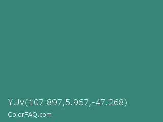 YUV 107.897,5.967,-47.268 Color is a normal cyan color and the nearest color is Celadon Green #2f847c. Hex code #368578 and RGB value is rgb(54,133,120). In RGB color space, this color is composed of 21% red, 52% green, 47% blue, In CMYK color space, this color is composed of 59% cyan, 0% magenta, 10% yellow , 48% black , In HSL color space, this color has a hue angle of 170° , 42% saturation and 37% lightness.
