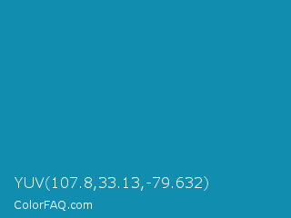 YUV 107.8,33.13,-79.632 Color is a normal cyan color and the nearest color is Blue Green #0d98ba. Hex code #118daf and RGB value is rgb(17,141,175). In RGB color space, this color is composed of 7% red, 55% green, 69% blue, In CMYK color space, this color is composed of 90% cyan, 19% magenta, 0% yellow , 31% black , In HSL color space, this color has a hue angle of 193° , 82% saturation and 38% lightness.