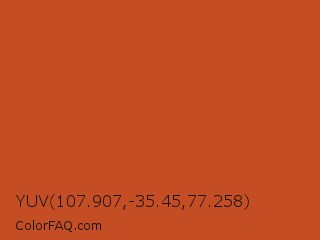 YUV 107.907,-35.45,77.258 Color is a normal color and the nearest color is Orange Roughy #c45719. Hex code #c44d24 and RGB value is rgb(196,77,36). In RGB color space, this color is composed of 77% red, 30% green, 14% blue, In CMYK color space, this color is composed of 0% cyan, 61% magenta, 82% yellow , 23% black , In HSL color space, this color has a hue angle of 15° , 69% saturation and 45% lightness.
