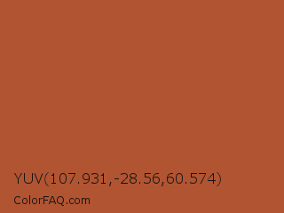 YUV 107.931,-28.56,60.574 Color is a normal orange color and the nearest color is Brown Rust #af593e. Hex code #b15432 and RGB value is rgb(177,84,50). In RGB color space, this color is composed of 69% red, 33% green, 20% blue, In CMYK color space, this color is composed of 0% cyan, 53% magenta, 72% yellow , 31% black , In HSL color space, this color has a hue angle of 16° , 56% saturation and 45% lightness.