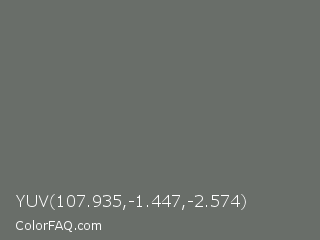 YUV 107.935,-1.447,-2.574 Color is a normal green color and the nearest color is Dim Gray #696969. Hex code #696e69 and RGB value is rgb(105,110,105). In RGB color space, this color is composed of 41% red, 43% green, 41% blue, In CMYK color space, this color is composed of 5% cyan, 0% magenta, 5% yellow , 57% black , In HSL color space, this color has a hue angle of 120° , 2% saturation and 42% lightness.