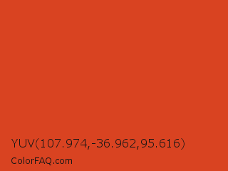 YUV 107.974,-36.962,95.616 Color is a normal red color and the nearest color is Vermilion #d9381e. Hex code #d94321 and RGB value is rgb(217,67,33). In RGB color space, this color is composed of 85% red, 26% green, 13% blue, In CMYK color space, this color is composed of 0% cyan, 69% magenta, 85% yellow , 15% black , In HSL color space, this color has a hue angle of 11° , 74% saturation and 49% lightness.