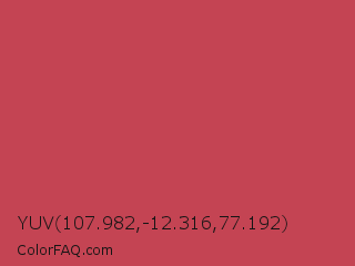YUV 107.982,-12.316,77.192 Color is a normal red color and the nearest color is Brick Red #cb4154. Hex code #c44453 and RGB value is rgb(196,68,83). In RGB color space, this color is composed of 77% red, 27% green, 33% blue, In CMYK color space, this color is composed of 0% cyan, 65% magenta, 58% yellow , 23% black , In HSL color space, this color has a hue angle of 353° , 52% saturation and 52% lightness.