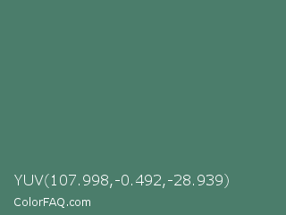 YUV 107.998,-0.492,-28.939 Color is a normal green color and the nearest color is Hookers Green #49796b. Hex code #4b7d6b and RGB value is rgb(75,125,107). In RGB color space, this color is composed of 29% red, 49% green, 42% blue, In CMYK color space, this color is composed of 40% cyan, 0% magenta, 14% yellow , 51% black , In HSL color space, this color has a hue angle of 158° , 25% saturation and 39% lightness.