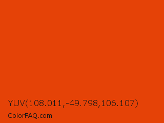YUV 108.011,-49.798,106.107 Color is a normal orange color and the nearest color is Trinidad #e64e03. Hex code #e54207 and RGB value is rgb(229,66,7). In RGB color space, this color is composed of 90% red, 26% green, 3% blue, In CMYK color space, this color is composed of 0% cyan, 71% magenta, 97% yellow , 10% black , In HSL color space, this color has a hue angle of 16° , 94% saturation and 46% lightness.