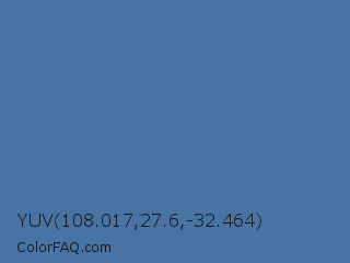 YUV 108.017,27.6,-32.464 Color is a normal blue color and the nearest color is Blue Yonder #5072a7. Hex code #4774a4 and RGB value is rgb(71,116,164). In RGB color space, this color is composed of 28% red, 45% green, 64% blue, In CMYK color space, this color is composed of 57% cyan, 29% magenta, 0% yellow , 36% black , In HSL color space, this color has a hue angle of 211° , 40% saturation and 46% lightness.