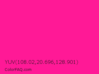 YUV 108.02,20.696,128.901 Color is a normal magenta color and the nearest color is Fluorescent Pink #ff1493. Hex code #ff1996 and RGB value is rgb(255,25,150). In RGB color space, this color is composed of 100% red, 10% green, 59% blue, In CMYK color space, this color is composed of 0% cyan, 90% magenta, 41% yellow , 0% black , In HSL color space, this color has a hue angle of 327° , 100% saturation and 55% lightness.