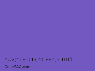 YUV 108.043,41.884,6.101 Color is a normal indigo color and the nearest color is Fuchsia Blue #7a58c1. Hex code #7358c1 and RGB value is rgb(115,88,193). In RGB color space, this color is composed of 45% red, 35% green, 76% blue, In CMYK color space, this color is composed of 40% cyan, 54% magenta, 0% yellow , 24% black , In HSL color space, this color has a hue angle of 255° , 46% saturation and 55% lightness.
