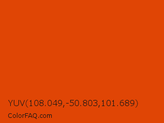 YUV 108.049,-50.803,101.689 Color is a normal orange color and the nearest color is Trinidad #e64e03. Hex code #e04505 and RGB value is rgb(224,69,5). In RGB color space, this color is composed of 88% red, 27% green, 2% blue, In CMYK color space, this color is composed of 0% cyan, 69% magenta, 98% yellow , 12% black , In HSL color space, this color has a hue angle of 18° , 96% saturation and 45% lightness.
