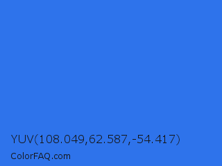 YUV 108.049,62.587,-54.417 Color is a normal blue color and the nearest color is Royal Blue #4169e1. Hex code #2e73eb and RGB value is rgb(46,115,235). In RGB color space, this color is composed of 18% red, 45% green, 92% blue, In CMYK color space, this color is composed of 80% cyan, 51% magenta, 0% yellow , 8% black , In HSL color space, this color has a hue angle of 218° , 83% saturation and 55% lightness.