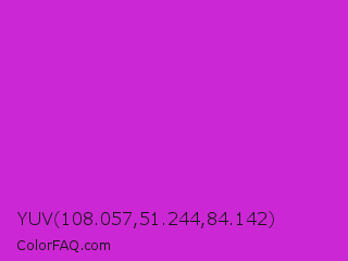YUV 108.057,51.244,84.142 Color is a normal magenta color and the nearest color is Steel Pink #cc33cc. Hex code #cc27d4 and RGB value is rgb(204,39,212). In RGB color space, this color is composed of 80% red, 15% green, 83% blue, In CMYK color space, this color is composed of 4% cyan, 82% magenta, 0% yellow , 17% black , In HSL color space, this color has a hue angle of 297° , 69% saturation and 49% lightness.