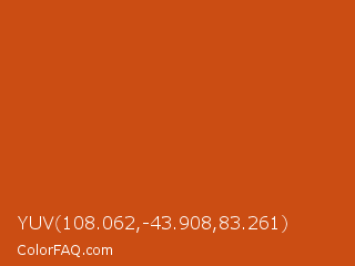YUV 108.062,-43.908,83.261 Color is a normal orange color and the nearest color is Orange Roughy #c45719. Hex code #cb4d13 and RGB value is rgb(203,77,19). In RGB color space, this color is composed of 80% red, 30% green, 7% blue, In CMYK color space, this color is composed of 0% cyan, 62% magenta, 91% yellow , 20% black , In HSL color space, this color has a hue angle of 19° , 83% saturation and 44% lightness.