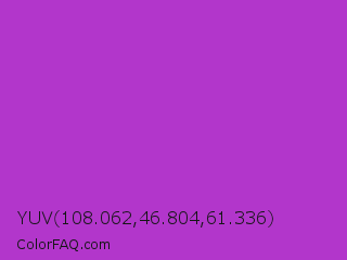 YUV 108.062,46.804,61.336 Color is a normal purple color and the nearest color is Dark Orchid #9932cc. Hex code #b236cb and RGB value is rgb(178,54,203). In RGB color space, this color is composed of 70% red, 21% green, 80% blue, In CMYK color space, this color is composed of 12% cyan, 73% magenta, 0% yellow , 20% black , In HSL color space, this color has a hue angle of 290° , 59% saturation and 50% lightness.