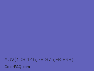 YUV 108.146,38.875,-8.898 Color is a normal blue color and the nearest color is Blue Violet #6456b7. Hex code #6262bb and RGB value is rgb(98,98,187). In RGB color space, this color is composed of 38% red, 38% green, 73% blue, In CMYK color space, this color is composed of 48% cyan, 48% magenta, 0% yellow , 27% black , In HSL color space, this color has a hue angle of 240° , 40% saturation and 56% lightness.