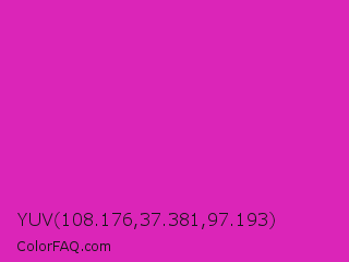 YUV 108.176,37.381,97.193 Color is a normal magenta color and the nearest color is Frostbite #e936a7. Hex code #db25b8 and RGB value is rgb(219,37,184). In RGB color space, this color is composed of 86% red, 15% green, 72% blue, In CMYK color space, this color is composed of 0% cyan, 83% magenta, 16% yellow , 14% black , In HSL color space, this color has a hue angle of 312° , 72% saturation and 50% lightness.