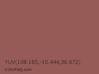 YUV 108.185,-10.444,36.672 Color is a normal red color and the nearest color is Au Chico #97605d. Hex code #965b57 and RGB value is rgb(150,91,87). In RGB color space, this color is composed of 59% red, 36% green, 34% blue, In CMYK color space, this color is composed of 0% cyan, 39% magenta, 42% yellow , 41% black , In HSL color space, this color has a hue angle of 4° , 27% saturation and 46% lightness.