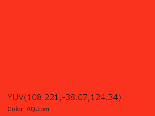YUV 108.221,-38.07,124.34 Color is a normal red color and the nearest color is Red RYB #fe2712. Hex code #fa331f and RGB value is rgb(250,51,31). In RGB color space, this color is composed of 98% red, 20% green, 12% blue, In CMYK color space, this color is composed of 0% cyan, 80% magenta, 88% yellow , 2% black , In HSL color space, this color has a hue angle of 5° , 96% saturation and 55% lightness.