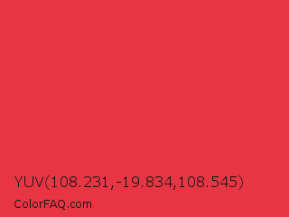 YUV 108.231,-19.834,108.545 Color is a normal red color and the nearest color is Deep Carmine Pink #ef3038. Hex code #e83544 and RGB value is rgb(232,53,68). In RGB color space, this color is composed of 91% red, 21% green, 27% blue, In CMYK color space, this color is composed of 0% cyan, 77% magenta, 71% yellow , 9% black , In HSL color space, this color has a hue angle of 355° , 80% saturation and 56% lightness.
