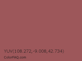 YUV 108.272,-9.008,42.734 Color is a normal red color and the nearest color is Redwood #a45a52. Hex code #9d575a and RGB value is rgb(157,87,90). In RGB color space, this color is composed of 62% red, 34% green, 35% blue, In CMYK color space, this color is composed of 0% cyan, 45% magenta, 43% yellow , 38% black , In HSL color space, this color has a hue angle of 357° , 29% saturation and 48% lightness.