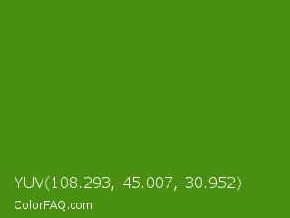 YUV 108.293,-45.007,-30.952 Color is a normal green color and the nearest color is Vida Loca #549019. Hex code #499011 and RGB value is rgb(73,144,17). In RGB color space, this color is composed of 29% red, 56% green, 7% blue, In CMYK color space, this color is composed of 49% cyan, 0% magenta, 88% yellow , 44% black , In HSL color space, this color has a hue angle of 94° , 79% saturation and 32% lightness.