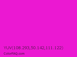 YUV 108.293,50.142,111.122 Color is a normal magenta color and the nearest color is Hot Magenta #ff1dce. Hex code #eb18d2 and RGB value is rgb(235,24,210). In RGB color space, this color is composed of 92% red, 9% green, 82% blue, In CMYK color space, this color is composed of 0% cyan, 90% magenta, 11% yellow , 8% black , In HSL color space, this color has a hue angle of 307° , 84% saturation and 51% lightness.