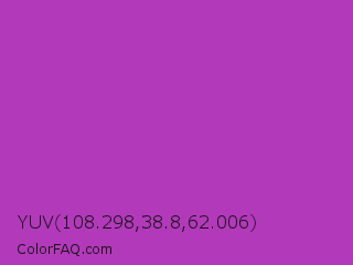YUV 108.298,38.8,62.006 Color is a normal magenta color and the nearest color is Byzantine #bd33a4. Hex code #b339bb and RGB value is rgb(179,57,187). In RGB color space, this color is composed of 70% red, 22% green, 73% blue, In CMYK color space, this color is composed of 4% cyan, 70% magenta, 0% yellow , 27% black , In HSL color space, this color has a hue angle of 296° , 53% saturation and 48% lightness.