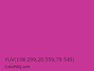 YUV 108.299,20.559,79.545 Color is a normal magenta color and the nearest color is Royal Fuchsia #ca2c92. Hex code #c73696 and RGB value is rgb(199,54,150). In RGB color space, this color is composed of 78% red, 21% green, 59% blue, In CMYK color space, this color is composed of 0% cyan, 73% magenta, 25% yellow , 22% black , In HSL color space, this color has a hue angle of 320° , 57% saturation and 50% lightness.