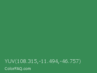 YUV 108.315,-11.494,-46.757 Color is a normal green color and the nearest color is Sea Green #2e8b57. Hex code #378c55 and RGB value is rgb(55,140,85). In RGB color space, this color is composed of 22% red, 55% green, 33% blue, In CMYK color space, this color is composed of 61% cyan, 0% magenta, 39% yellow , 45% black , In HSL color space, this color has a hue angle of 141° , 44% saturation and 38% lightness.
