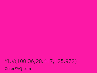 YUV 108.36,28.417,125.972 Color is a normal magenta color and the nearest color is Persian Rose #fe28a2. Hex code #fc18a6 and RGB value is rgb(252,24,166). In RGB color space, this color is composed of 99% red, 9% green, 65% blue, In CMYK color space, this color is composed of 0% cyan, 90% magenta, 34% yellow , 1% black , In HSL color space, this color has a hue angle of 323° , 97% saturation and 54% lightness.