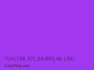 YUV 108.371,64.893,46.156 Color is a normal purple color and the nearest color is Veronica #a020f0. Hex code #a138f0 and RGB value is rgb(161,56,240). In RGB color space, this color is composed of 63% red, 22% green, 94% blue, In CMYK color space, this color is composed of 33% cyan, 77% magenta, 0% yellow , 6% black , In HSL color space, this color has a hue angle of 274° , 86% saturation and 58% lightness.