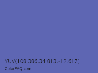 YUV 108.386,34.813,-12.617 Color is a normal blue color and the nearest color is Scampi #675fa6. Hex code #5e66b3 and RGB value is rgb(94,102,179). In RGB color space, this color is composed of 37% red, 40% green, 70% blue, In CMYK color space, this color is composed of 47% cyan, 43% magenta, 0% yellow , 30% black , In HSL color space, this color has a hue angle of 234° , 36% saturation and 54% lightness.